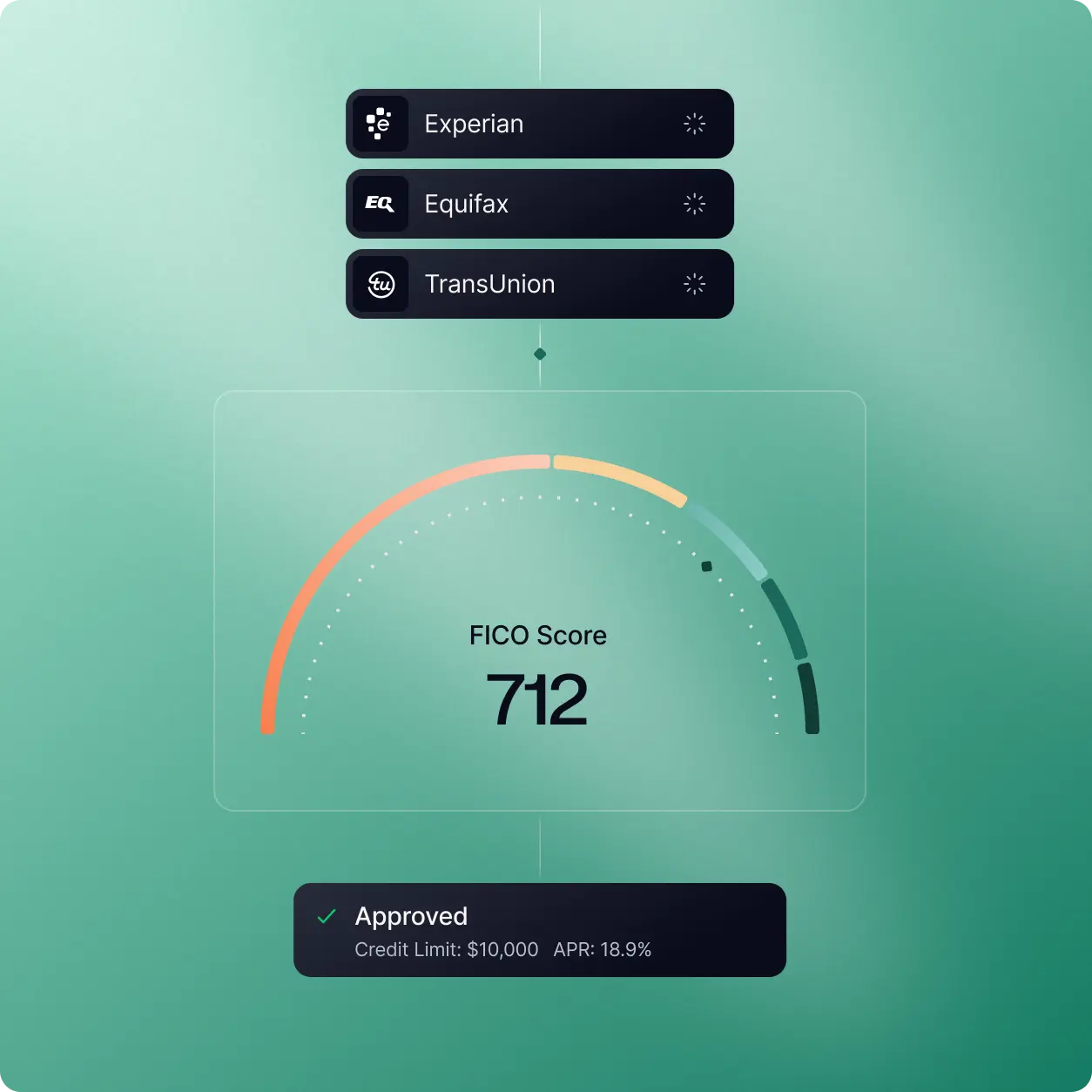 Use configurable decisioning workflows to blend platform data with bureau, identity, cash-flow, and fraud signals.