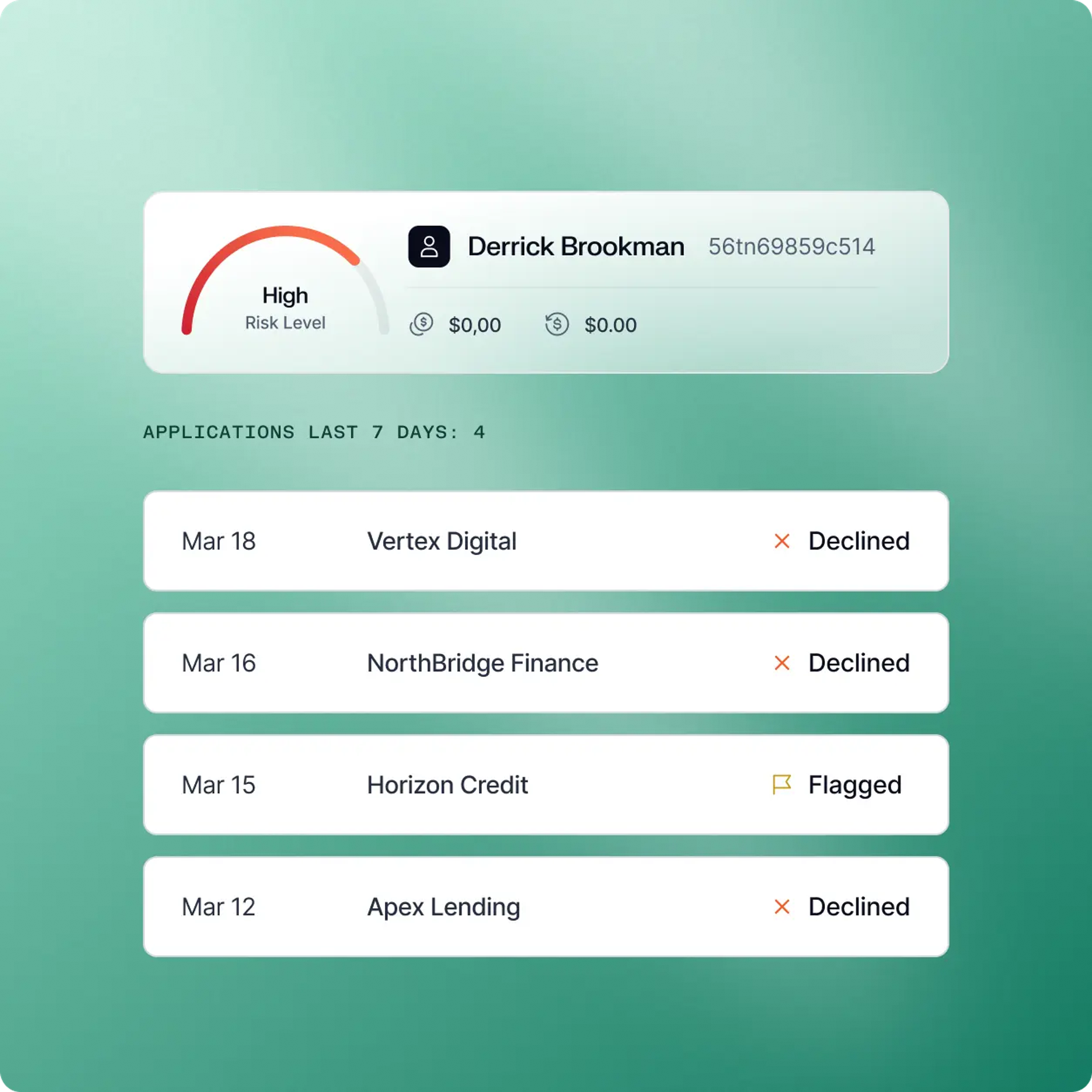 Assess individual applicants using unified bureau, cash-flow, identity, and behavioral signals in one real-time workflow.