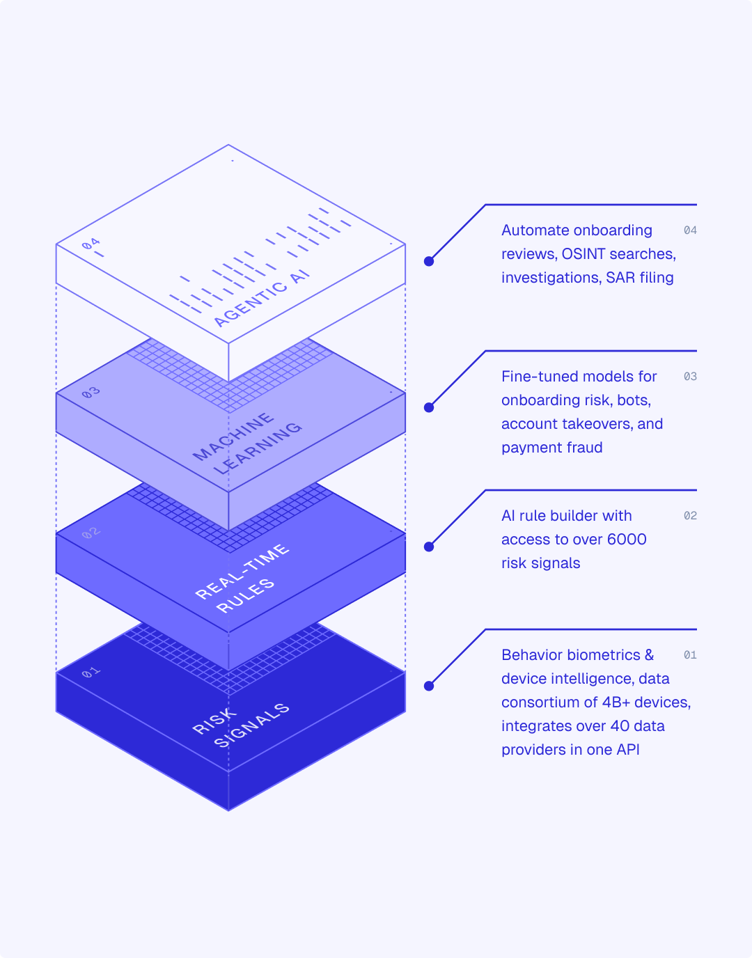 Sardine provides modular building blocks to manage risk across the entire customer journey. And with the introduction of AI agents across core workflows from customer onboarding to payments and account protection, Sardine enables organizations to stay ahead of increasingly sophisticated attacks. Learn why risk teams turn to Sardine when they need to stay ahead of fast-moving, AI-powered attacks.