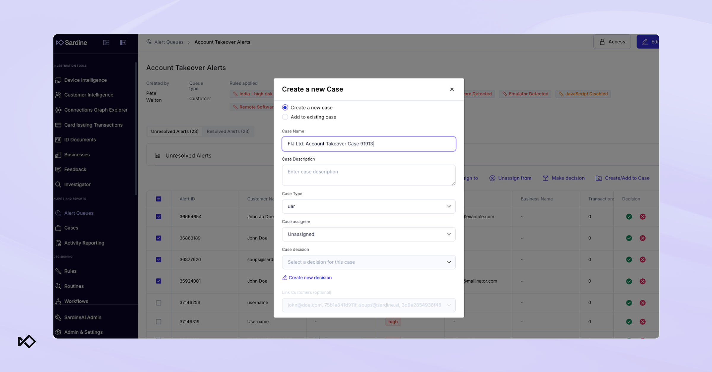 Creating cases manually from alerts can slow analysts down and introduce inconsistencies. Sardine now makes it possible to generate cases directly from alerts
