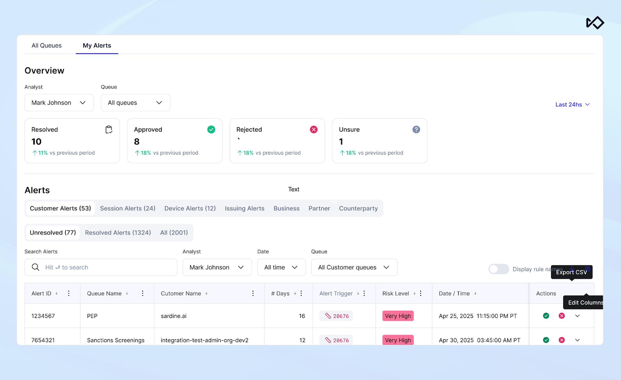 As alert volumes grow, managing triage efficiently becomes a team-wide challenge. The new My Alerts view gives every analyst a personalized, organized workspace within the Sardine Dashboard — consolidating assigned alerts, prioritization cues, and performance insights in one place.