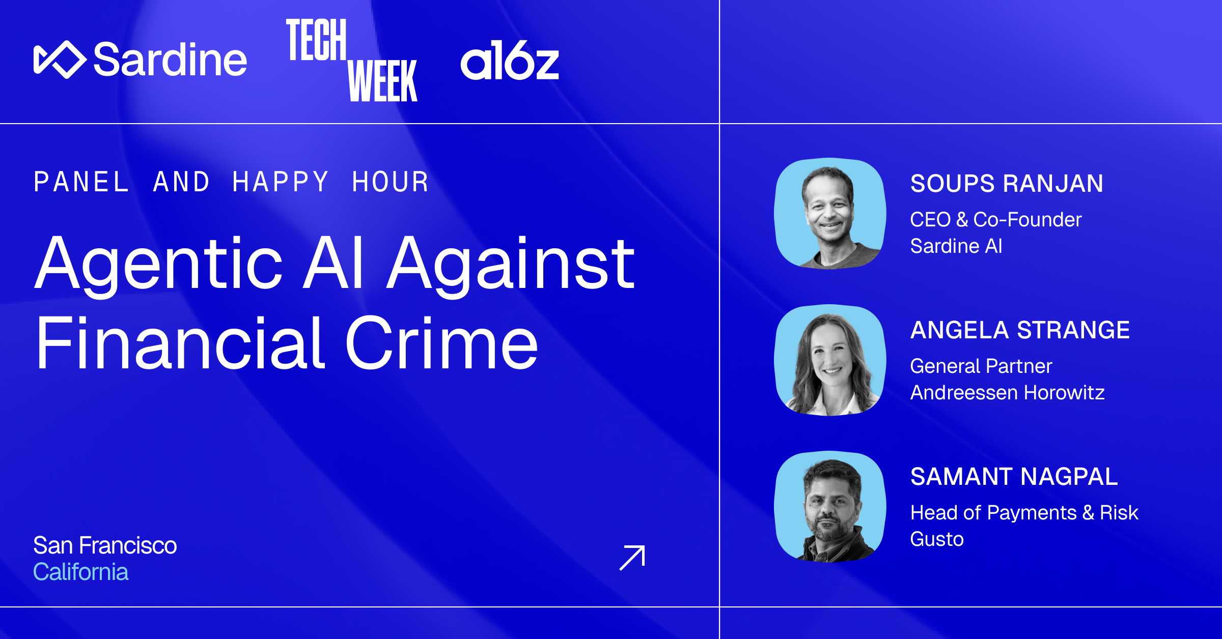 Hosted by Sardine AI and Gusto, you’ll hear from Soups Ranjan (CEO & Co-founder, Sardine), Samant Nagpal (Head of Payments & Risk at Gusto), and Angela Strange (General Partner, Andreessen Horowitz), about emerging AI threats and how companies are using AI agents to make risk operations more effective.