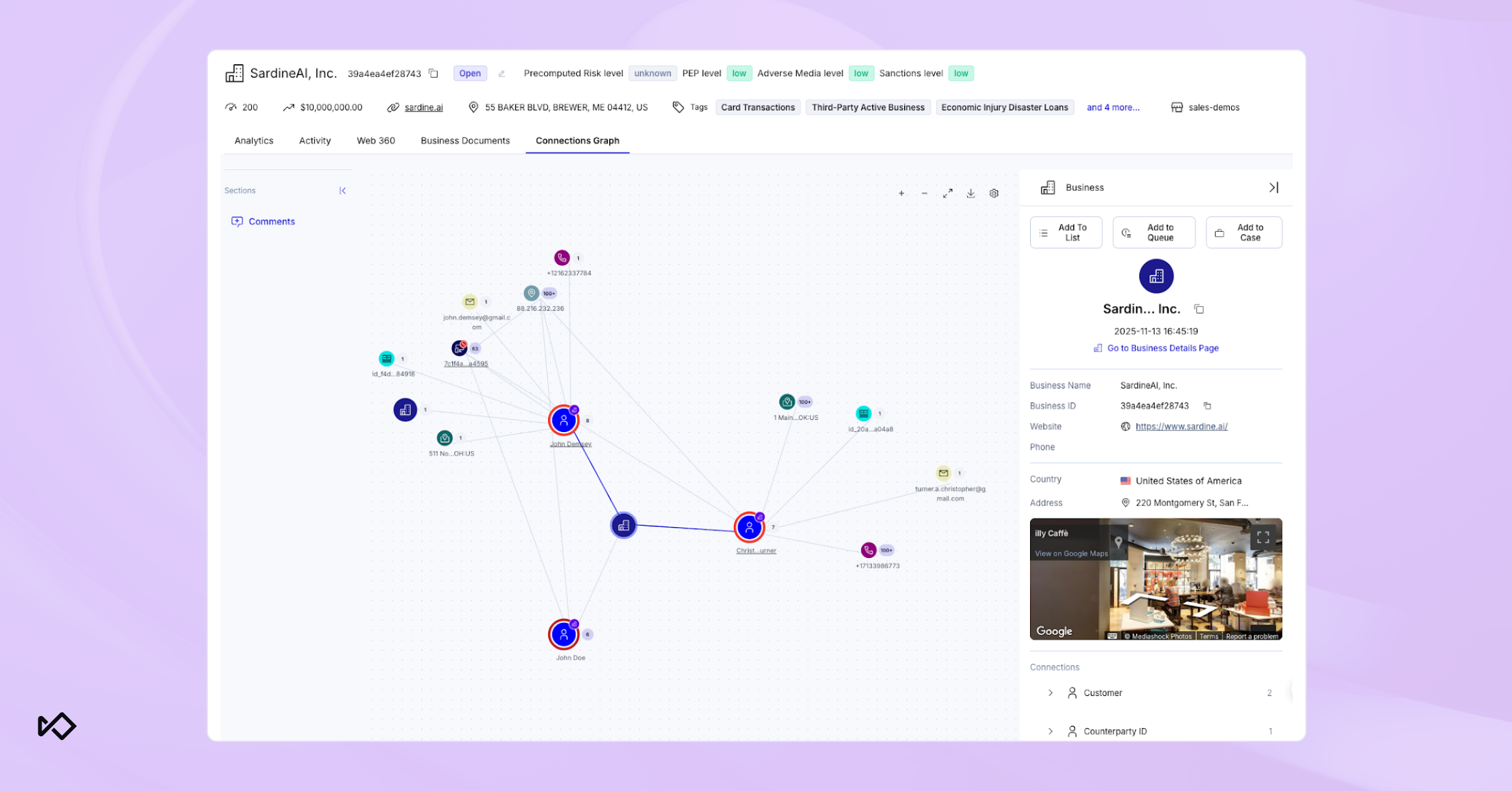 The Connections Graph now visualizes relationships between business entities and their associated Customer IDs, allowing for deeper merchant investigation. Now analysts can trace shared devices, IPs, or accounts so they can identify hidden networks, shared users, and overlapping risk profiles between businesses and individuals, all within a single graph.